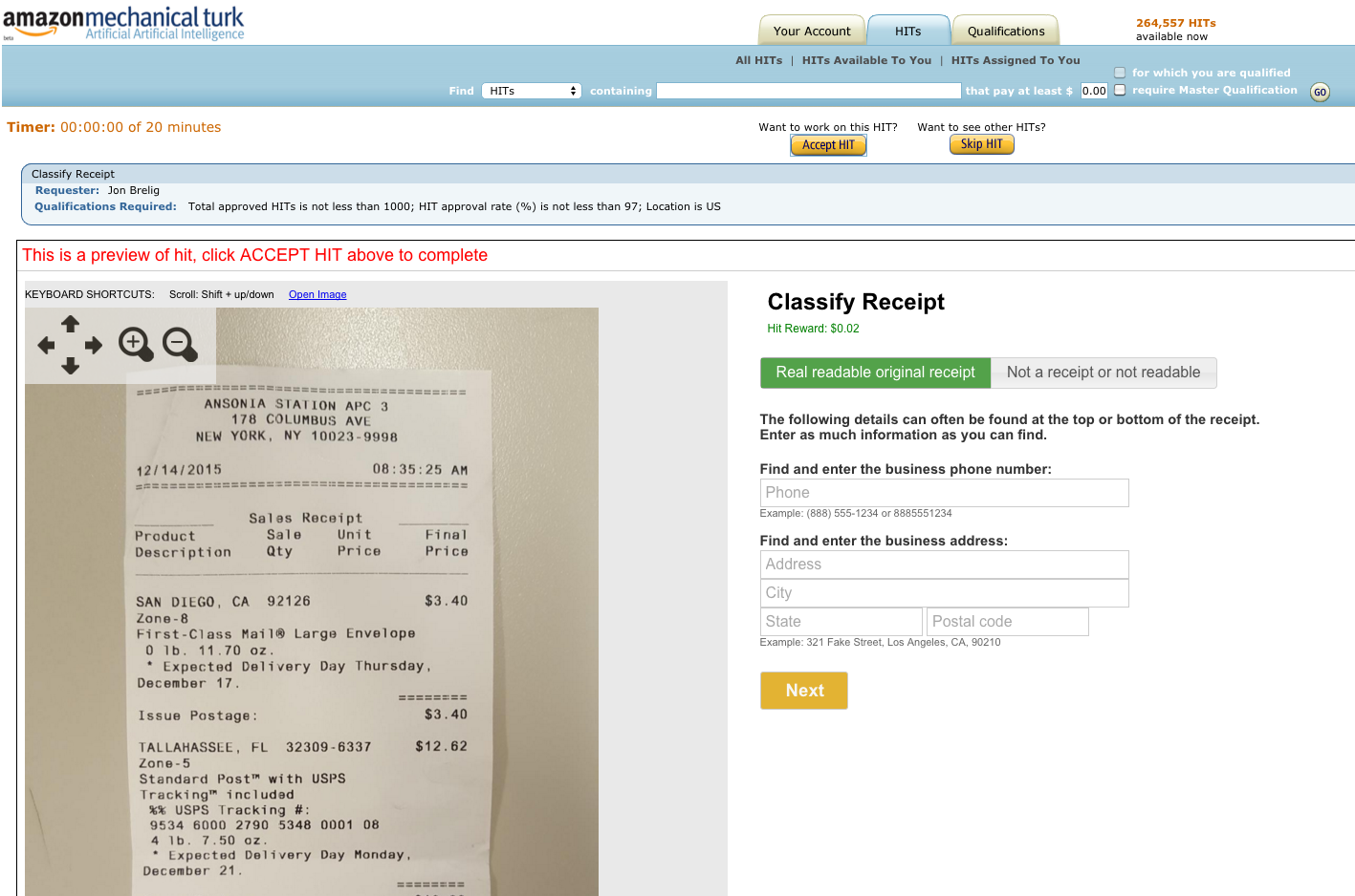 Et eksempel på de opgaver, der udbydes på Amazon Mechanical Turk. Med to cent per kvittering skal en "turk" indtaste firmanavn, adresse og eventuelt telefonnummer i lyntempo for at tjene blot et par dollar i timen.