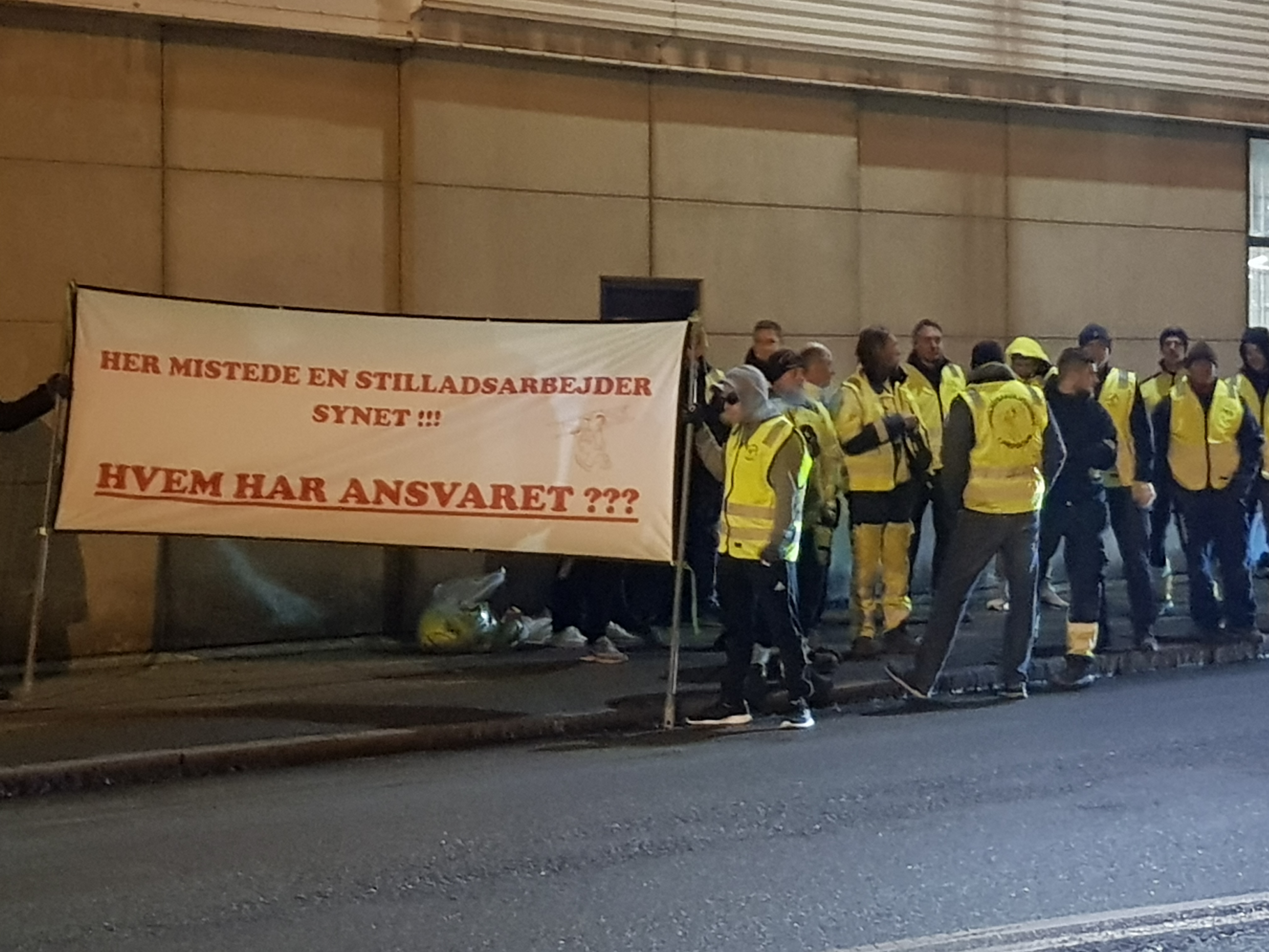Klokken 6:00 her til morgen tog en flok stilladsarbejdere opstilling ved porten til oliehavnen i Aarhus. Med sig havde de en stak løbesedler og et banner med teksten 'Her mistede en stilladsarbejder synet!!! Hvem har ansvaret?'