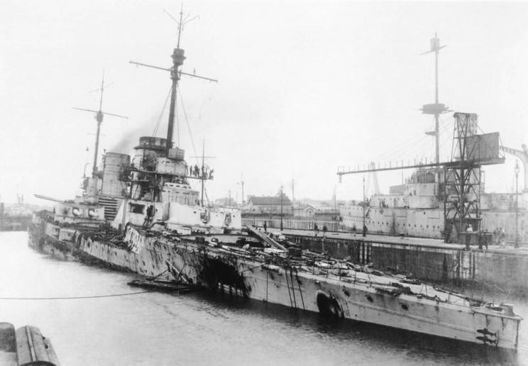 Slagkrydseren SMS Seydlitz sikkert i havn efter at være blevet ramt af ikke mindre end fyrre svære granater under slaget.