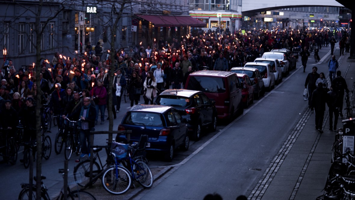 Helt anderledes lød det i Aarhus, hvor tidligere efterretningsofficer Anders Kærgaard talte til et stort arrangement på Godsbanen med efterfølgende fakkeltog til Store Torv.