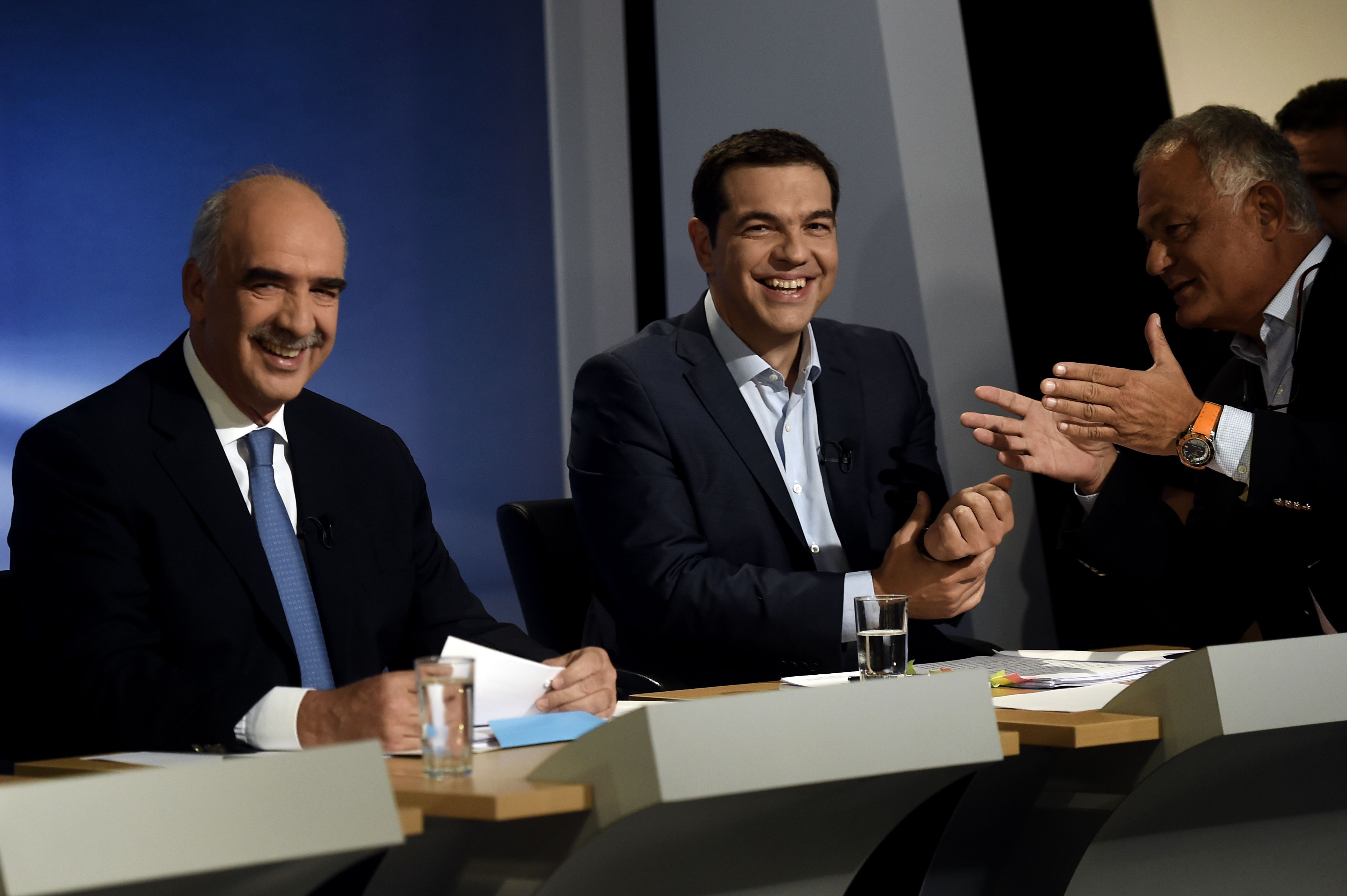 Både tidligere premierminister og leder af Syriza Alexis Tsipras, der her ses til venstre og Vangelis Meimarakis, leder af det konservative Nyt Demokrati, støtter begge den seneste aftale med EU og IMF.